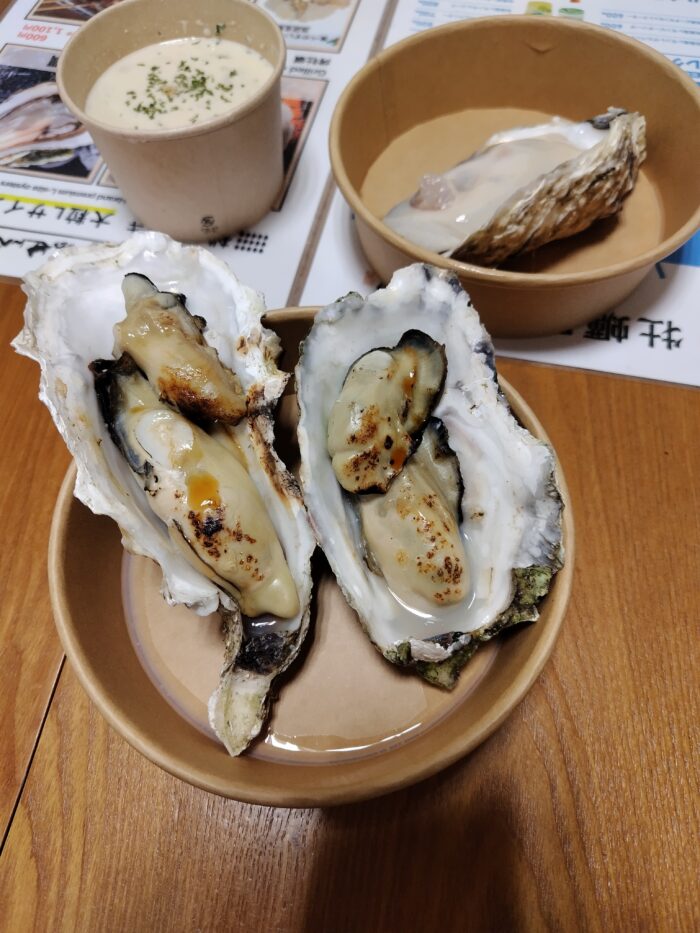 焼きガキは香ばしく絶品、牡蠣入りのカレーパンは意外な組み合わせなのにしっかり美味しい。笹かまをその場で焼いて食べたり、大きな煎餅をかじったり。歩きながら少しずつ楽しめました。