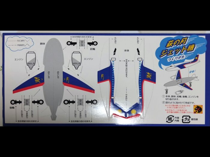 定番の「萩の月」。三つ入りの小さいパッケージを買ったら外箱の裏に飛行機のクラフトがついていて、夫が気に入ってくれました(彼は、プラモデルとかが大好きです。)