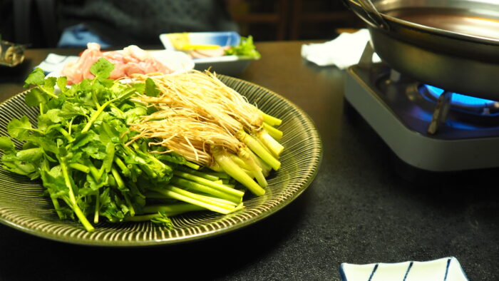 地元の友人によると、せり鍋は家庭も作る料理らしく、根っこは美味しいけど洗うのが大変とのことでした。